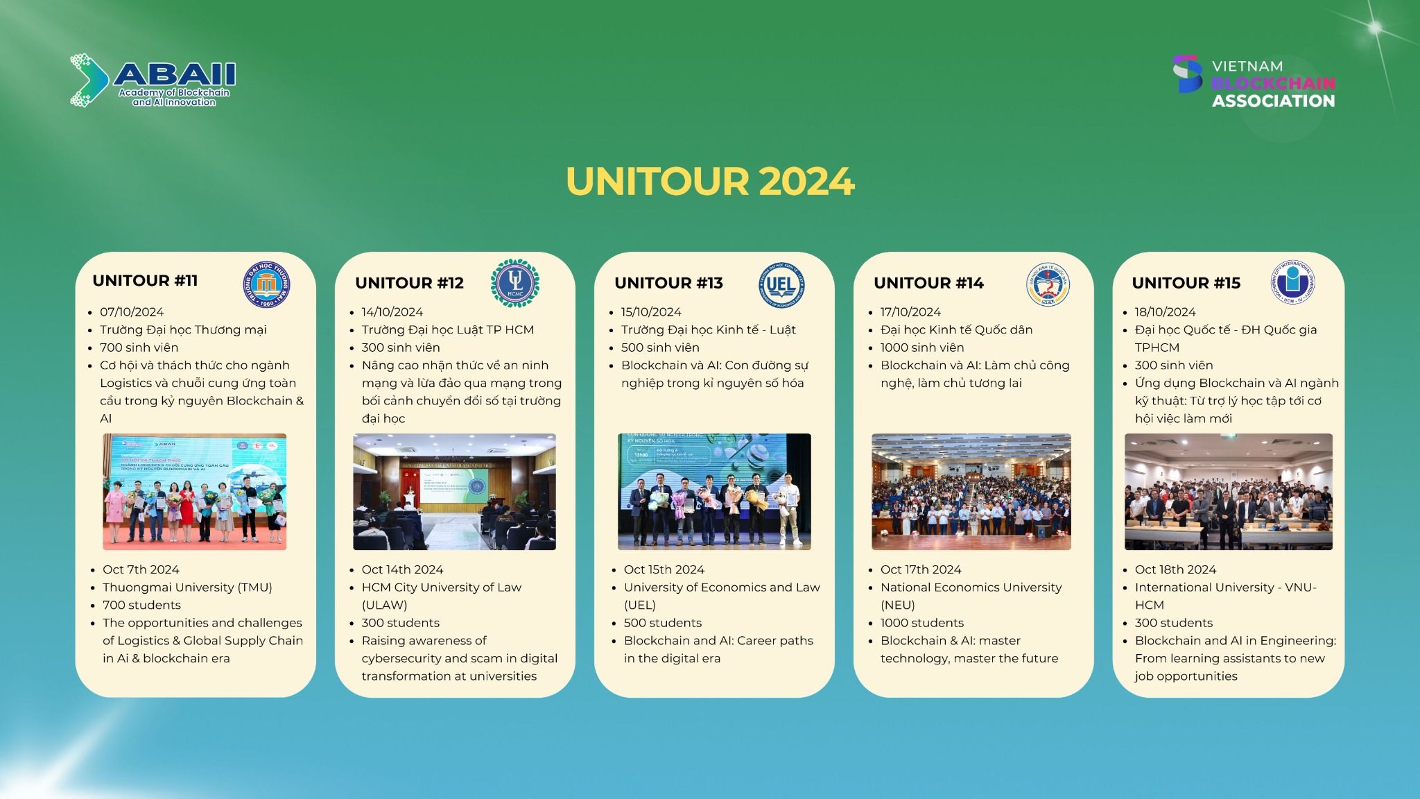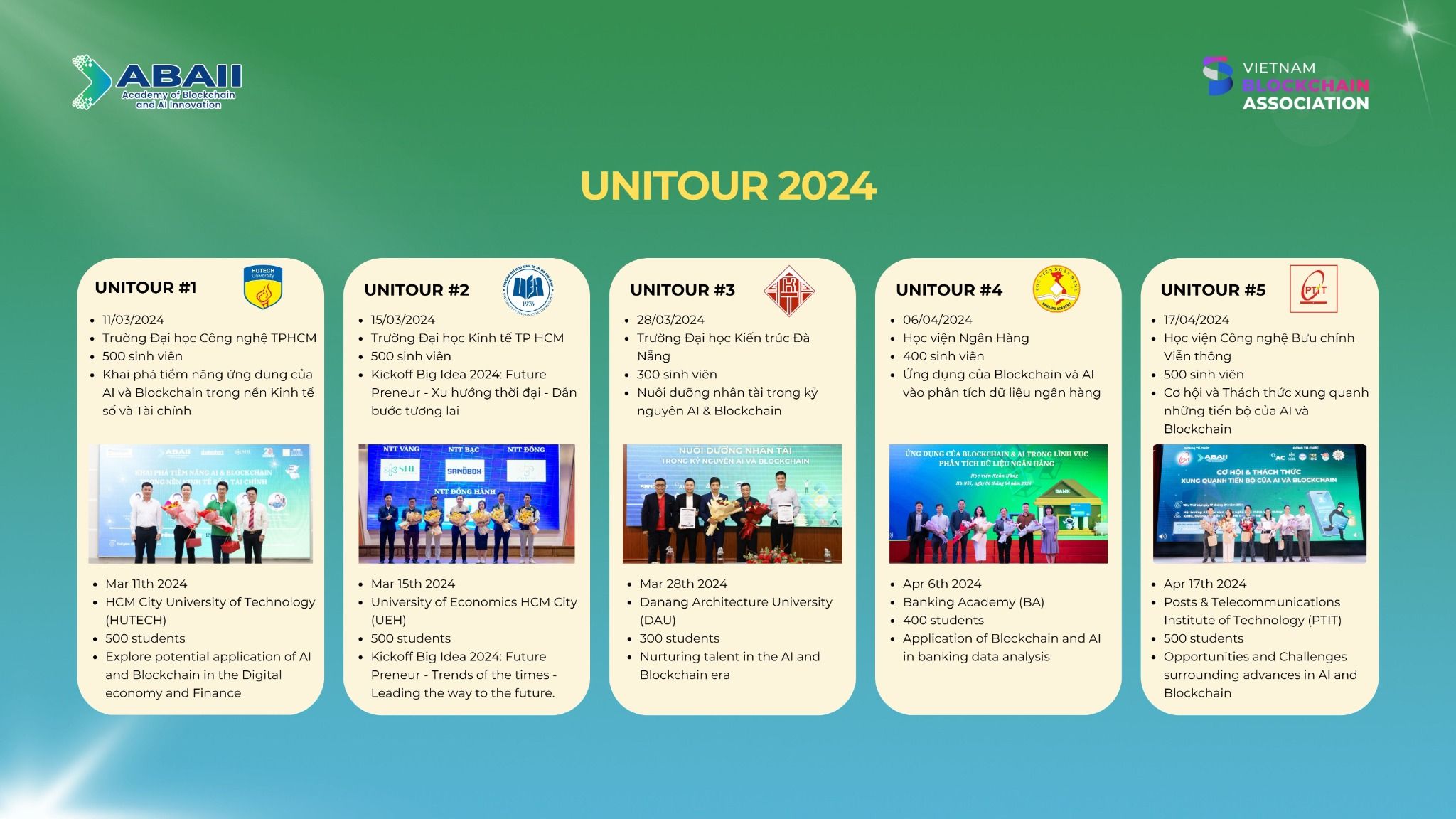 UniTour là chương trình khám phá tiềm năng ứng dụng AI và Blockchain dành cho sinh viên tại các trường đại học trên khắp Việt Nam, do Hiệp hội Blockchain Việt Nam (VBA) phối hợp với Viện Công nghệ Blockchain và trí tuệ nhân tạo ABAII combo tổ chức trong suốt năm 2024 - 2025.